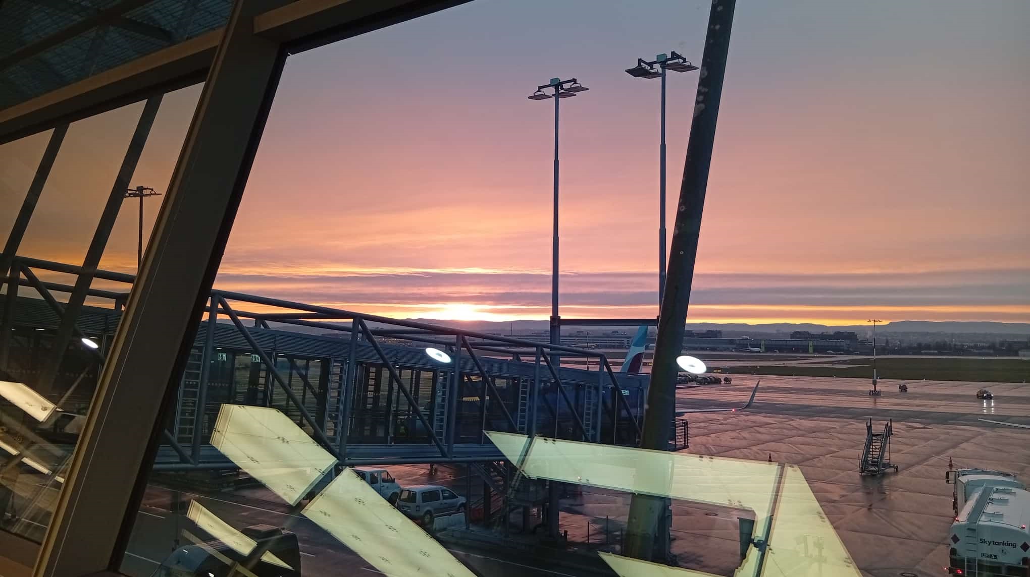 Der prächtige Sonnenaufgang am Himmel versprach einen sanften Einstieg in den Tag und ließ uns auf einen ruhigen Flug mit einer ebenso harmonischen Landung hoffen. Die Wolkenformationen wirkten wie ein natürliches Gemälde, das uns willkommen hieß.